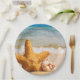 Paper plates with a cute photograph of a starfish positioned upright in the sand. Underneath it's arm is a little seashell resting comfortably. Set on a beach with waves crashing in the background.