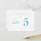Aqua starfish table number cards. Beach wedding, double-sided seating cards with a template for adding bride and groom names, wedding date and table numbers. The centre is white with blue numbers.
