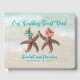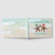 Two starfish brides guest book cover with three lines of custom text. Beach scene background and brown starfish with floral wreaths in blue and green and pink and orange.
