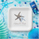 Starfish couple wedding paper plates. Brown and blue sea star images represent the couple in this design on square, white paper plates. Customise two lines of text with names of the couple and one more line of text. The sample wording is, “The adventure begins - with date”. Use at casual pre-wedding showers and parties, or to serve cake at the reception.