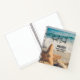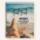 A personalised spiral guest book with a scenic photo. A big starfish set upright on a sandy beach. A beautiful blue sea with waves of white surf in the background.