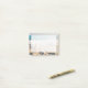 Sticky notes with a scenic photo. A big starfish set upright on a sandy beach. A beautiful blue sea with waves of white surf in the background.