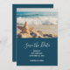 Save the date card with a scenic photo. A big starfish set upright on a sandy beach. A beautiful blue sea with waves of white surf in the background.