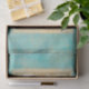 Stressed wood in a pretty teal colour with a starfish in the centre. Great beachy design.