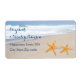 A wedding label design that highlights photo of a starfish pair on the sand of a beach. A modern design for your destination summer beach wedding.