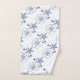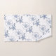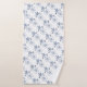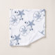 A beautiful repeating pattern in blue and white of a single starfish and the outline of a pansy shell which has small bubbles next to it.