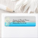 A beautiful photograph of a sandy white beach infused with a starfish and bubble graphic with crystal clear turquoise blue water and a sunny blue sky on which the bridal parties guest's names and address, or their own, appear