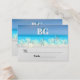 A beautiful photograph of a sandy white beach infused with a starfish and bubble graphic with crystal clear turquoise blue water and a sunny blue sky on which the bridal couples initials; the guest's name, table number and a personalised thank you message from the bridal couple appear.