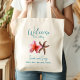 Cloth tote bags to use as wedding favour bags with a tropical theme. The starfish and pink plumeria design, along with four lines of custom text, is printed on both sides of this bag style. Choose a handle colour, and put in hotel rooms to thank guests for attending the event. Or change the text to say "welcome". Wording will automatically change on both sides.