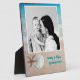 Standing photo plaque keepsake with a beach scene and seashells design. Upright 8x10 inch photo display will have your photo imprinted and custom text in the lower corner. A realistic sea star and sand dollar decorate the space beneath the picture. This lovely photo keepsake is perfect for a beach loving family and any type of photo memory will work in the square frame.