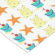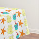 Tablecloth features an original marker illustration of a series of beach-themed designs including a sandcastle, pail, and starfish.