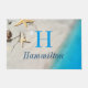 A light sandy beach scene at the waters edge with half buried starfish and shells design featuring your personalised monogram letter and full family name. Great for a beach house!