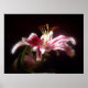 Close up photo of a pink and white speckled stargazer lily on a black background. One large blossom basks in the glowing sunlight while another bloom hides subdued in the shadows beyond like an echo or a reflection.
