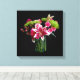 A stargazer lily bouquet is a bright splash of pink and green on a dramatic square black background. Spider mums, gerbera daisies and pink and white carnations round out the bouquet. Lilium 'Stargazer' (the Stargazer lily) is a hybrid lily of the Oriental group. Oriental lilies are known for their fragrant perfume, blooming mid-to-late summer. The Stargazer lily was created in 1974 by Leslie Woodriff, a lily breeder in California. Woodriff called the new cross 'Stargazer', because the blooms faced towards the sky. As beautiful as they are, stargazer lilies are toxic to cats, so keep them away from your feline friends. This photograph is rendered in a watercolor style.