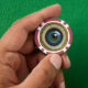 Just the iris and pupil of an eyeball. The iris is formed of three concentric rings, each inset deeper than the last. The outermost is white with yellow-brown striations. The middle is dark blue with white to light blue striations. The green centre is overcome with yellow striations. The pupil is small round and black.