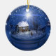 Inside a snow globe is a winter landscape with a cottage overshadowed by bare maple and cherry trees. In the windows of the little house candles burn, and on the lawn a Christmas tree sparkles with red and gold. It's an evening at Christmastime, and the lights of a thousand tiny stars fill the globe, with one great Christmas star filling the night with its rays, while the warm beams from inside the cottage light up the surrounding landscape.