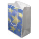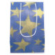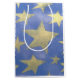 This gift bag features a bold stenciled design of glowing gold stars on a blue background.
