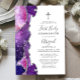 The left-hand edge of this elegant modern first communion invitation features a watercolor agate border in shades of blue, pink and purple, sprinkled with twinkling stars and trimmed with faux silver glitter. A faux silver foil cross appears above the customisable text, which combines handwriting, copperplate and italic fonts in charcoal grey on a white background. The reverse side features a matching agate design.