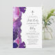 The left-hand edge of this elegant modern first communion invitation features a watercolor agate border in shades of blue, pink and purple, sprinkled with twinkling stars and trimmed with faux silver glitter. A faux silver foil cross appears above the customisable text, which combines handwriting, copperplate and italic fonts in charcoal grey on a white background. The reverse side features a matching agate design.