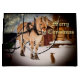 Photo with paint effect, Christmas night with stars on the sky. With A horse in front of a sledge waiting for someone, Santa maybe? At a farm outdoor with snow and rabbits running freely in the courtyard. A rabbit is standing on two feet and "talking" to the horse. With the text: Merry Christmas.