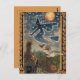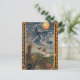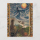 This unique, vintage Halloween postcard features an autumn scene with a black cat, white owl and bat playing in a harvested wheat field with pumpkins. A beautiful starry night with a witch flying through the sky on a broomstick formed from the stars.
