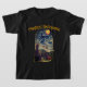 Womens Halloween T-Shirt with a star-studded witch flying across the night sky over fields of pumpkin, with a black cat, an owl, a bat, and a moon that looks like a pumkin. This is a vintage 1913 Halloween design.