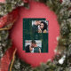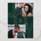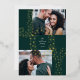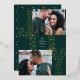 An elegant and unique holiday photo card design featuring two horizontal or landscape orientated photos aligned at the corners, with "JOY" overlaid in starry gold foil lettering on a contrasting dark forest green background. Personalise with your family name and the year in the centre.