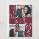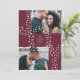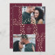 An elegant and unique holiday photo card design featuring two horizontal or landscape orientated photos aligned at the corners, with "JOY" overlaid in starry lettering on a contrasting dark burgundy plum background. Personalise with your family name and the year in the centre.