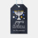 Festive Hanukkah gift tags feature "joyous Hanukkah" in white lettering on a navy blue background accented with a lit menorah and white, blue and gold stars. Personalise with your names beneath.