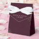 The 'Starry Night Deep Crimson Wedding Favour Boxes' offer a stylish and memorable way to thank your guests. Each favour box is dressed in an elegant deep crimson, resembling the mysterious allure of the evening sky. The edges are kissed with a touch of golden star dust, adding a sprinkle of celestial magic. Adorned with a white ribbon, these boxes carry the names of the newlyweds and the date of their union in a sophisticated font, making it a lovely keepsake that guests can treasure. These boxes are perfect for housing small gifts, sweets, or mementos from your enchanted evening wedding.
