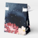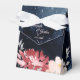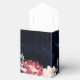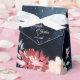 This Starry Night Floral wedding tent favour box inspires either a midnight summer theme or a dark winter of snow theme, making it a seasonally versatile design. The navy blue, almost black, watercolor with a celestial star or snowflake filled sky, combined with the pop of minimal pink flowers and calligraphy is sure to speak to the magic of your marriage celebration, regardless of the time of year.