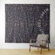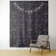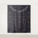 A starry night effect dark background to use as a photo backdrop at Christmas parties, with the typography Merry Christmas curved from the top in white over a pattern of gold stars on navy blue.