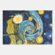 Vibrant and dynamic AI image interpretation of Vincent van Gogh's "Starry Night." It features a swirling, turbulent sky dominated by shades of deep blue and punctuated by large, swirling stars in various sizes and intensities of yellow and white. Below, a cluster of dark, cypress-like trees stands tall against the cosmic backdrop. The overall style is expressive and textured, with thick brushstrokes creating a sense of movement and energy throughout the piece.