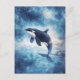 This ethereal postcard features a majestic orca whale breaching gracefully through a dreamlike, celestial atmosphere. The killer whale's body is beautifully rendered with deep indigo and navy watercolor textures, appearing to merge with the vast cosmos. Above, a vibrant teal and indigo galaxy swirl is filled with brilliant shimmering stars and white stardust. The lower half of the scene features a misty blue ocean surface that reflects the light of the nebulae above. The airy, magical lighting and soft-focus textures create a powerful sense of wonder and cosmic beauty. This postcard is an ideal choice for sending an inspirational message, a thoughtful note to a marine life enthusiast, or for use as a piece of dreamy, nature-inspired wall decor.