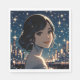 a smiling anime woman with short, wavy hair. She’s wearing an off-shoulder dress, adding to the relaxed and dreamy atmosphere. The overall vibe is calm and nostalgic, perfectly capturing the essence of lo-fi aesthetics.