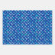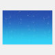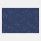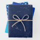 Wrapping paper in the twelve zodiac constellations, a starry sky shading from turquoise to deep blue, and satin textured stars against a deep indigo background