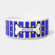 White ceramic dog food / water bowl, with blue, white, and yellow stripe pattern, with rows of yellow stars. A big black and white cartoon bone text area, on the front of the bowl, has blue custom text ready to personalise, with your pet's name. Lovely gift idea for any dog owner.