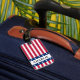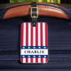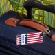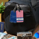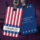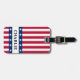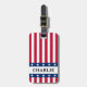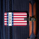 Luggage tag featuring red and white stripes and your custom name in between blue star borders.