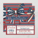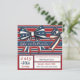 Fun and bold cute coquette bows appear on the front of this customisable July 4th Independence Day celebration invitation. Bows have patriotic stars and stripes appearing on them and are in front of a solid red and blue and white striped background. The reverse of this customisable party invitation has an oversized bow with the same striped background.
