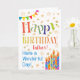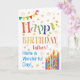 A colourful, text-based Birthday Card for a Father, with Polka Dot Bunting, bright, striped birthday cake candles and sprinkled with gold-effect stars. The patterned text says, 'Happy Birthday' and there is also 'Have a wonderful day!' in blue lettering (NB the gold effect stars and outlines will be as seen and not be printed in metallic ink.)