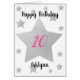 Personalised birthday girl card that features silver stars sprinkled across the front. You can easily personalise the big silver star with her birthday age and name underneath the star. The inside card message reads "For a girl who sparkles and shines like no other! Happy Birthday!" can also be easily personalised if you wanted. The back of the personalised birthday card reads Happy Birthday 2018.