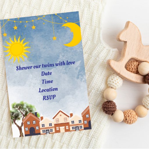 Adorable napkins for your twin baby shower or birthday party. Residential street complete with landscaping, sun, moon, and stars.