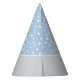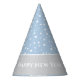 This party hat is shown in a blue and white stars print. Text in coordinating color states Happy New Year.