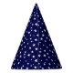 This party hat is shown in a deep blue and white stars print.