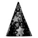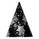 This party hat is shown in a black colour with a print of fun silver stars all over it.