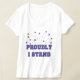 Stars of red and blue with text of blue that reads Proudly I Stand, to show your support for standing for the national anthem.