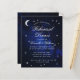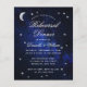 A budget rehearsal dinner invitation for a celestial wedding theme, with the moon and star on a starry night blue background. The title Rehearsal Dinner and the names are written in an elegant calligraphic script. The moon and the stars are faux silver foil, the text is white. On the black, there is only the moon and star on a starry night blue background.