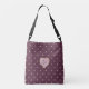 Pink hearts form a polka dot pattern on a rich port wine background. Hiding inside some of the hearts is a gold star with an emulated metallic shine, creating a playful and cute design. Customise the monogram with your own initial to make a unique accessory. This bag is available in multiple sizes and both tote bag and cross body bag styles.
