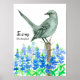 A poster decorated with a grey mockingbird on a post with blooming bluebonnet wildflowers drawn with ink and painted with watercolor. Inspired by the state bird and state flower of Texas.