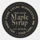 Customise this label with your state name in curved text along the top of this label. Simple and Elegant Round Black Maple Syrup Label with the words "Maple Syrup" in an embossed metallic gold font. Dashed line border in gold.